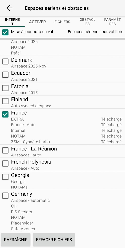 Retourne dans le menu Espaces aériens, sous Internet cette fois, puis déroule la liste et sélectionne France.